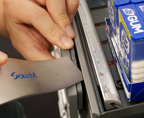 Insert the green label removal tool into the top of the label.